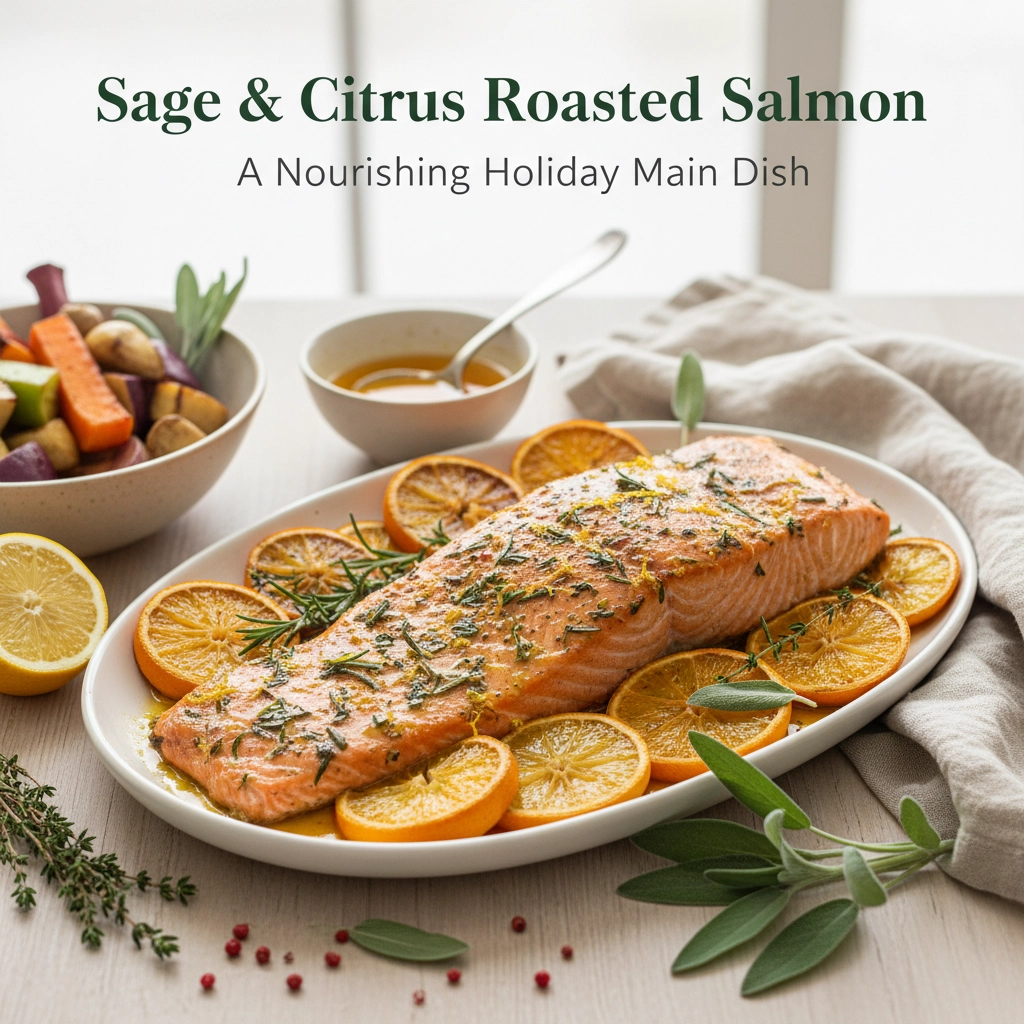 The holidays don’t have to mean compromising your wellness goals. This sage and citrus roasted salmon brings together festive flavors with nourishing ingredients, creating a main dish that feels indulgent without leaving you sluggish or bloated. It’s the perfect example of how mindful eating can be both celebratory and aligned with your body’s needs.